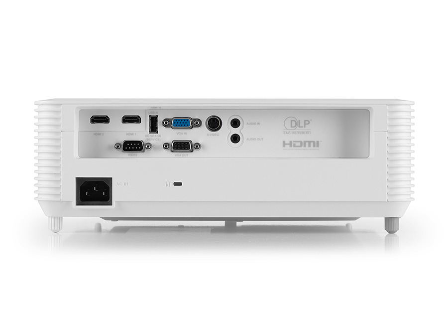 Priključki: HDMI 2x, VGA, S-Video, Avdio, RS-232, VGA izhod, Avdio izhod, USB (napajanje), Kensington Lock.