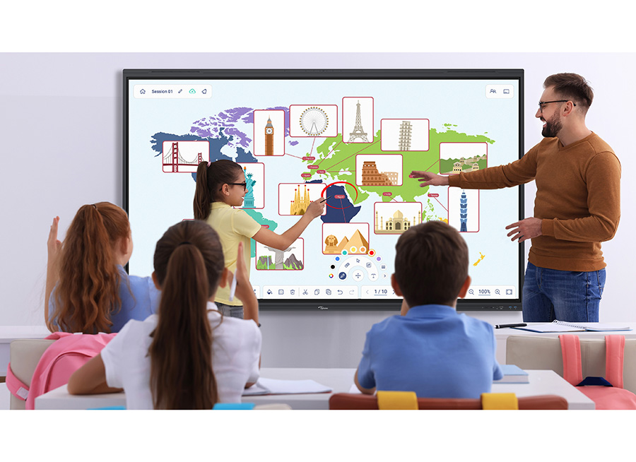 OPTOMA 5863RK INTERAKTIVNI LCD ZASLON 86″, 4K ločljivost, 450 cd/m2, do 50/32 točk dotika Windows/Android, funkcija bele table, Google Play Store, vgrajeni 18W zvočniki in 8W globokotonci ter 8 matričnih mikrofonov, teža 63,5 kg.